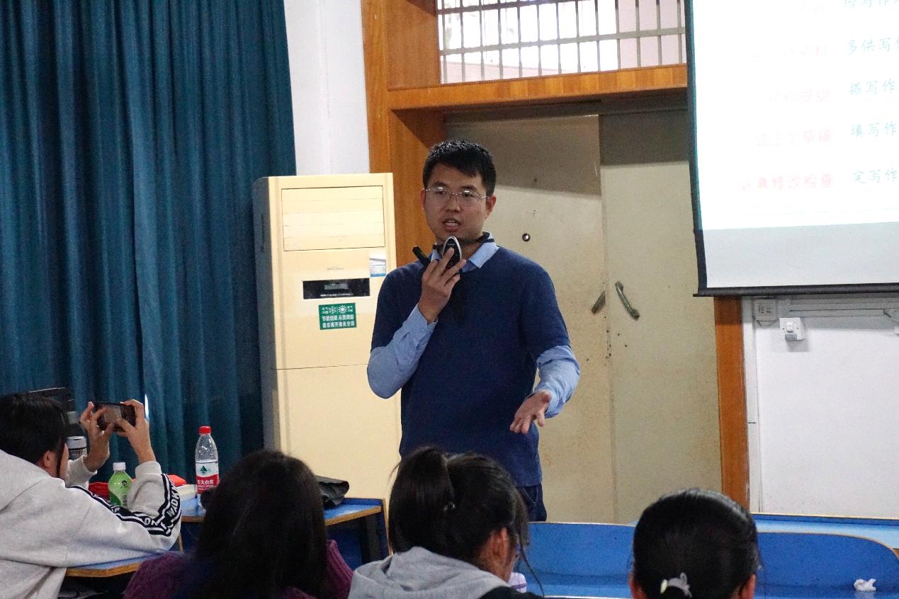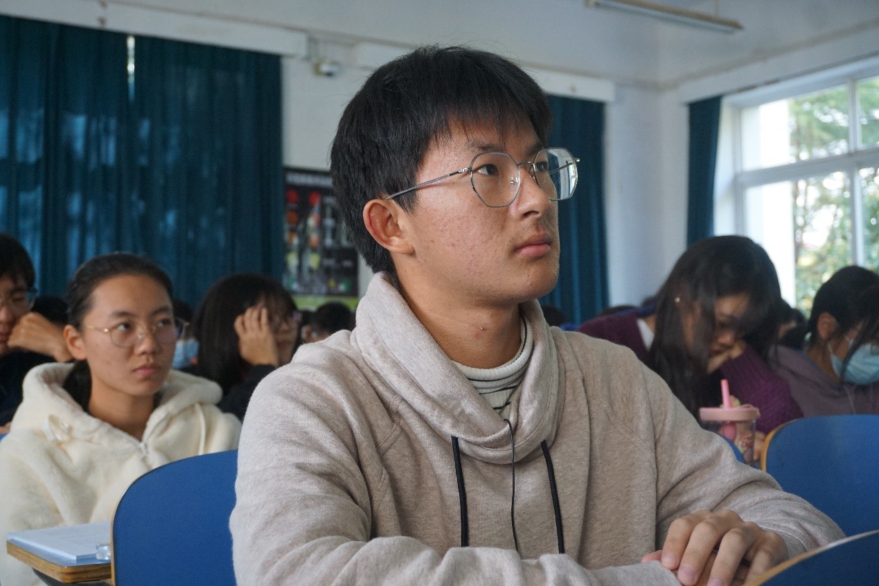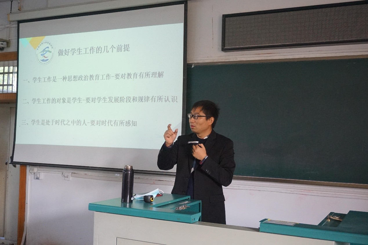 谭文伦以“做好学生工作的前提”开讲。他同学员们共同探讨了“何为教育”这个问题,融入自身对于近代教育变迁的感受,并巧妙运用“二次元”“躺平”等网络热词,生动地讲述了作为学院的学生干部,应当如何去看待学生工作,并在实践中肩负起应有的使命担当,以奋进促成长,做有格局的资源学子。