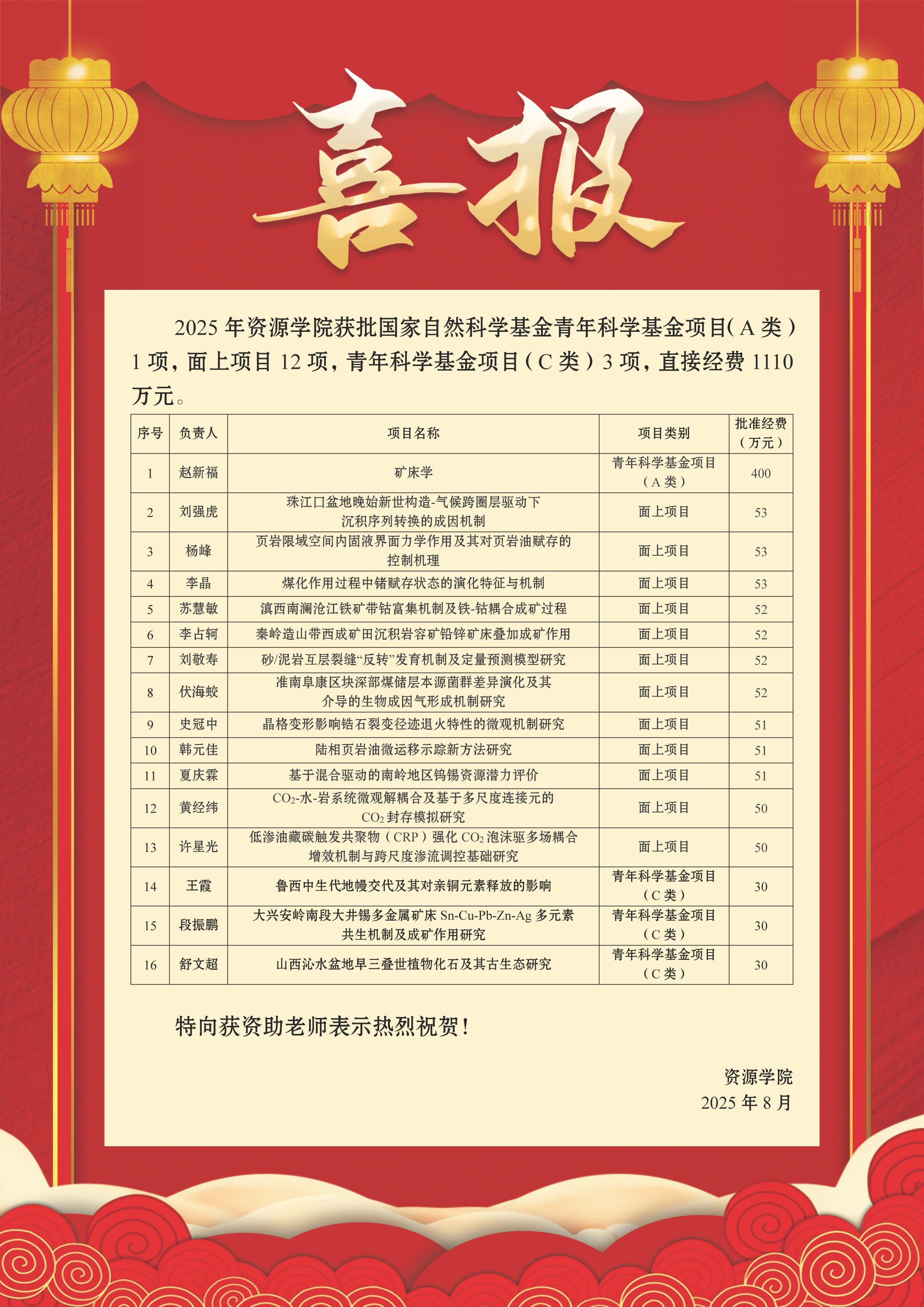 获批资助项目共16项。其中,青年科学基金项目(A类)1项,面上项目12项,青年科学基金项目(C类)3项。项目直接经费达1110万元,较2024年增长63.2%,经费数量位居全校第二。