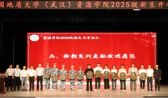 全体院领导为新生代表配发地质包。