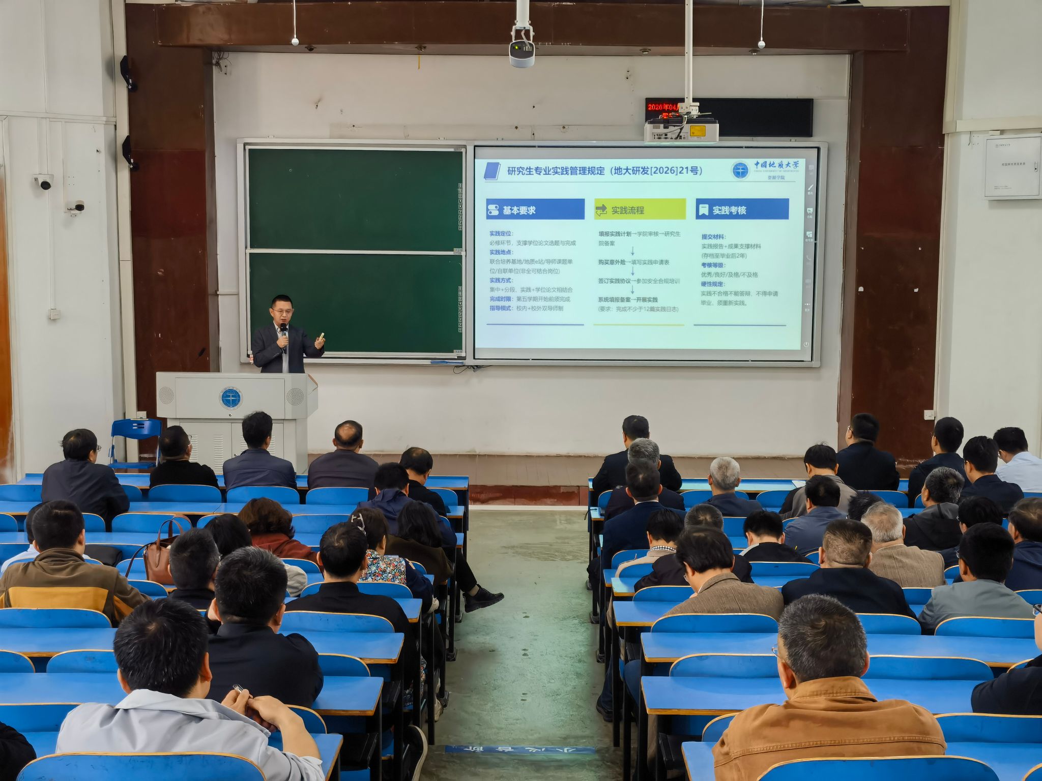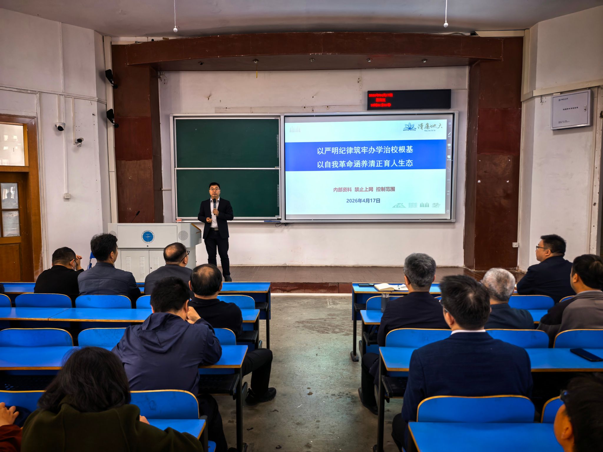 汪再奇作“以严明纪律筑牢办学治校根基,以自我革命涵养清正育人生态”专题报告。他指出,教育领域反腐倡廉是全面从严治党的重要组成部分,也是高校办学治校的基础性工程,事关党的教育事业的健康发展和立德树人根本任务的落实。高校教师必须深刻认识教育腐败的严重危害性,持续强化师德师风与校风学风建设,筑牢拒腐防变的思想防线。随后,他结合高校领域招生腐败、违规套取科研经费、学术不端、违规吃喝等典型案例开展警示教育,深入剖析问题根源和惨痛教训,以案明纪、以案说法,并带领全体教职工学习了《中国共产党纪律处分条例》相关条款。