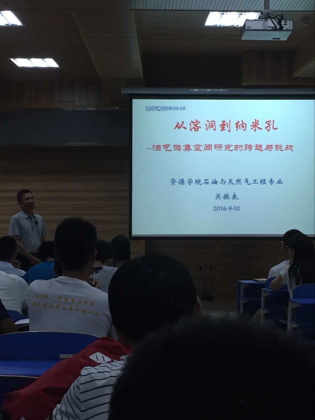 秭归实习教学团队队长关振良教授在综合楼三楼阶梯教室给基地师生演讲了一堂题为“从溶洞到纳米孔—油气储集空间的跨越与挑战”的公开课。此次南华讲堂是秭归产学研基地的传统项目,旨在邀请经验丰富的教授、专家介绍实习区相关的地学知识和人文知识,对开阔学生视野、激发学生的学习兴趣,以及更好地了解秭归基地的地质构造特征有重要意义。