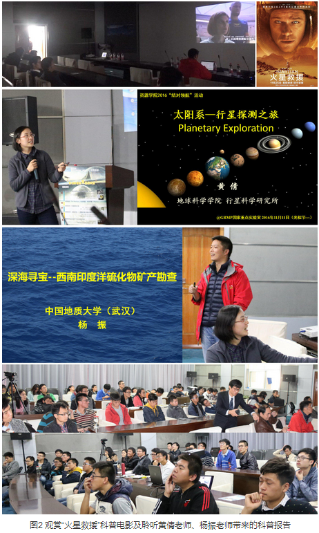 资源系杨振老师带来的“深海寻宝——西南印度洋硫化物矿产勘查”科普报告,同学们对深空、深海地质工作中各种高新技术手段以及科研过程充满了兴趣。接下来,徐启东教授、陈建国教授、黄倩老师及杨振老师就地质专业的苦与乐、行星地质及海洋地质方面的专业问题、地质类专业的人才培养等话题与学生开展了互动,学生们积极踊跃提问,气氛活跃,老师们幽默风趣而不失语重心长地为同学们指点迷津。最后,国际地球科学协会地大学生分会(IAMG-SCC)介绍了研究生方面的学习活动及将来在本科生中的会员发展计划,并继续分享了“救援火星”科普电影。