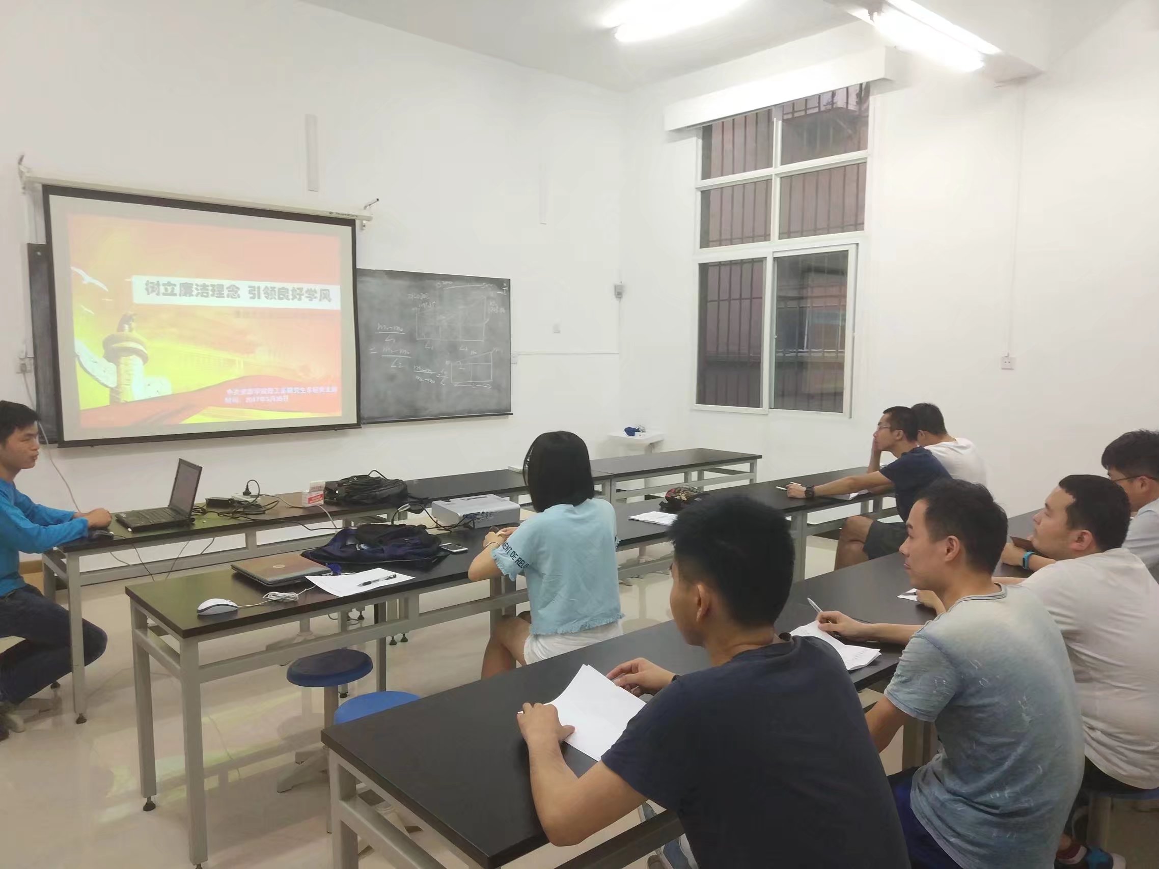煤工系研究生党支部在煤工系实验室开展以“廉政文化与学风建设”的主题党日活动。党支部书记邹志维以 “树立廉洁理念,引领良好学风”为题,从大学生“廉政文化教育意义”、“当前党风廉政建设的新常态”、“树立廉洁理念的新风尚”三个方面带领大家学习。