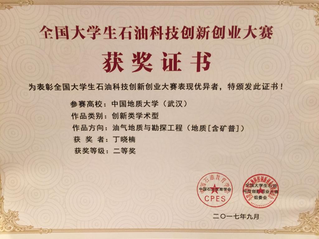 副院长石万忠教授带队参赛,丁晓楠同学凭借其作品《铂族元素在雪峰隆起西缘固体沥青-源岩对比中的应用》荣获创新类二等奖,沈传波教授荣获优秀指导教师奖。