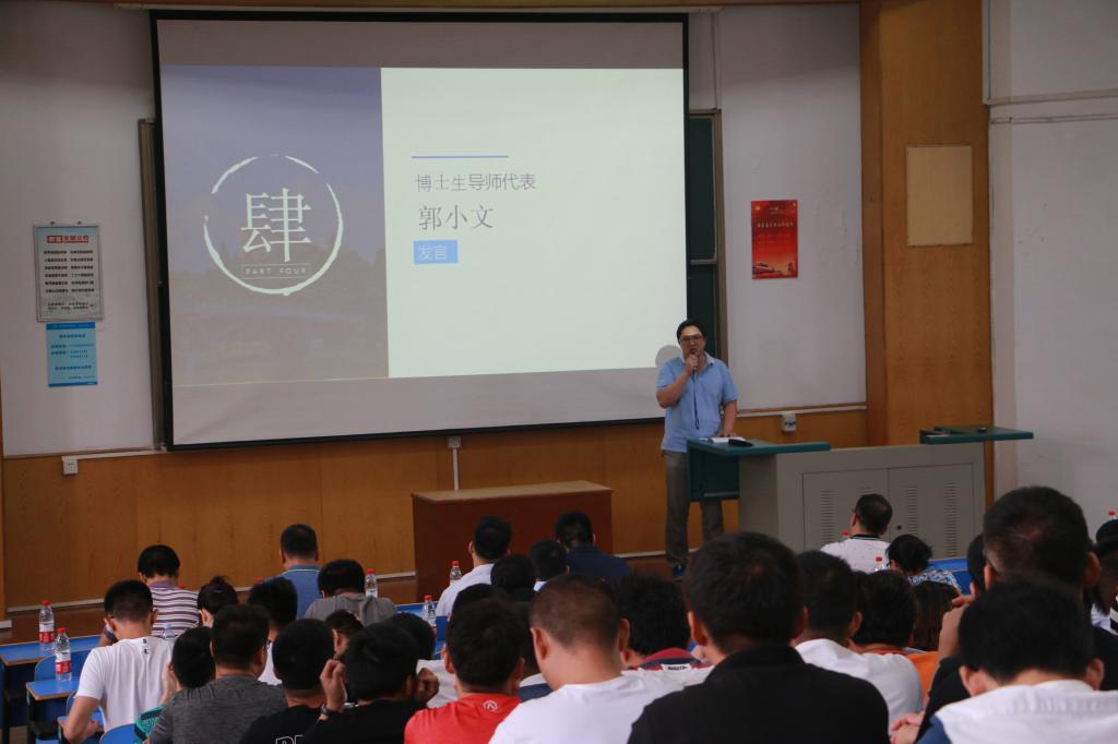 博士生导师代表郭小文发言。对于即将开启研究生旅程的同学们,他提出要明确目标、培养专业兴趣,形成金字塔式的基础知识、尽快进入研究状态,找到科学问题,大胆质疑,认真求证,诚实做人,踏实做事,以最好的状态迎接即将到来的生活。