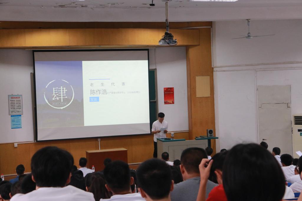 优秀老生代表陈作浩、杨锐分别发言。陈作浩以激情、规划、兴趣三个关键词为主题,将自己大学成长的感悟与本科生进行分享。杨锐分享了自己博士期间学习科研的经历,指出要充分相信自己的能力、用好国内外导师和实验室资源、高校利用时间,做好科研工作。