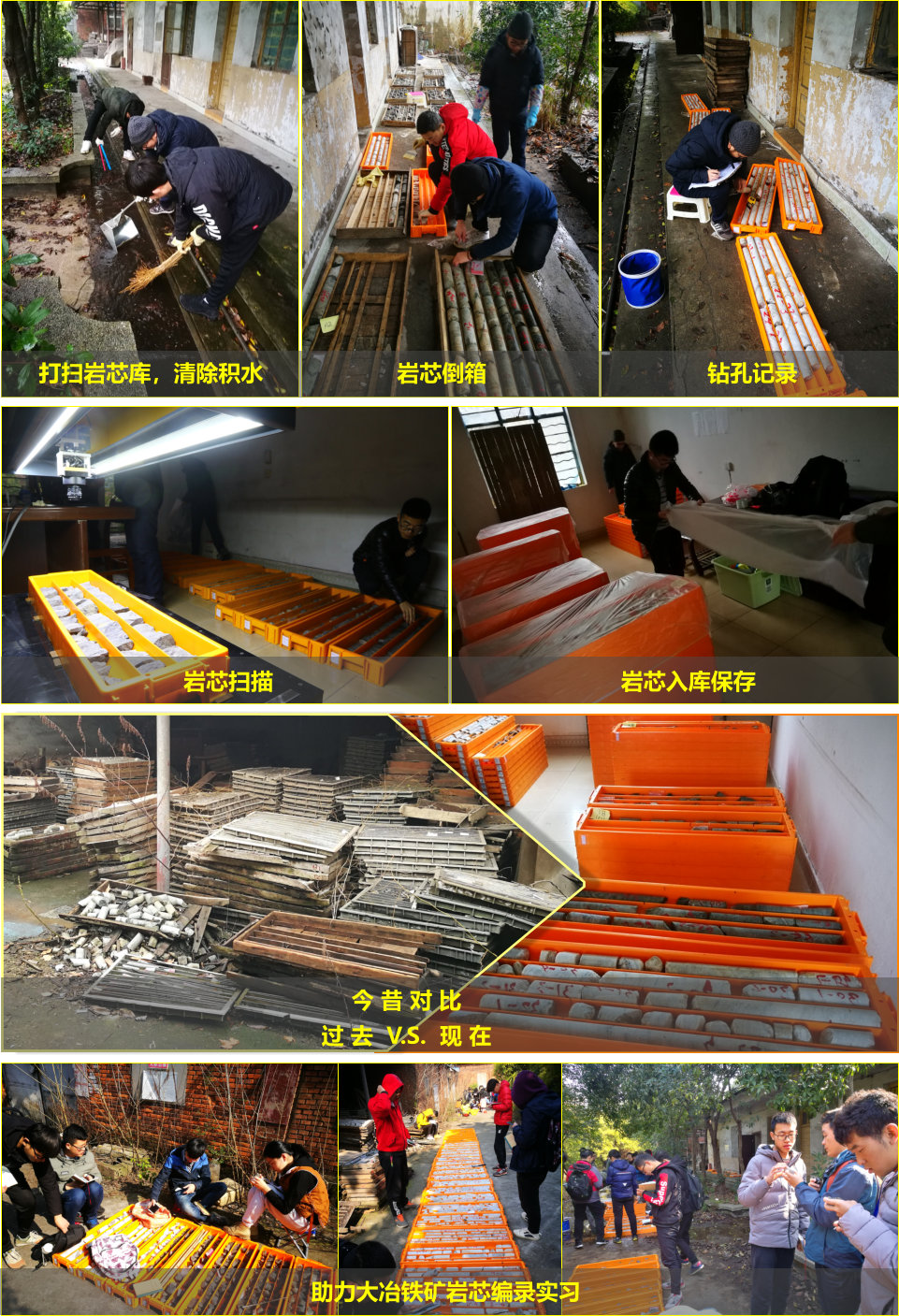 陈志军老师团队及合作公司技术人员前往大冶铁矿开展了11根典型钻孔的岩芯倒箱、岩芯图像扫描工作。大冶铁矿岩芯库所在的钻机队用房常年处于无人管理状态,钻孔堆放混乱、岩芯箱损毁严重,对典型岩芯亟需加强保护以便资源勘查工程(固体方向)专业的岩芯编录实习常态化开展。