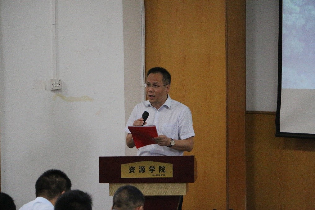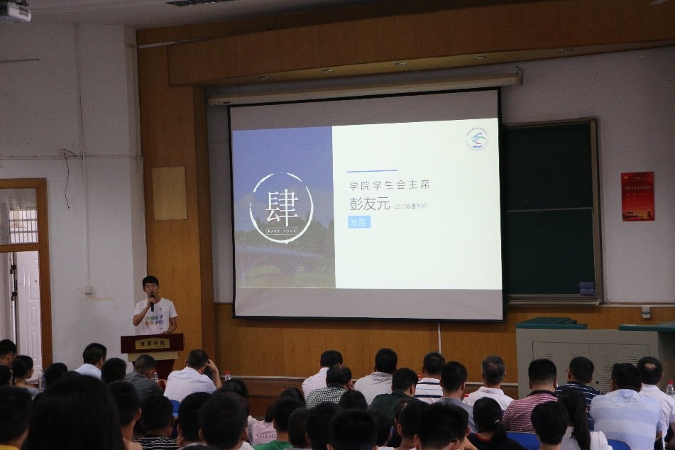 2019届学生会主席彭友元发言。彭友元将自己充实奋进的大学生活与新生分享,鼓励新生要养成自律的习惯、制定自己的目标、培养地质人的情怀。以激情、规划、兴趣三个关键词为主题,将自己大学成长的感悟与本科生进行分享。