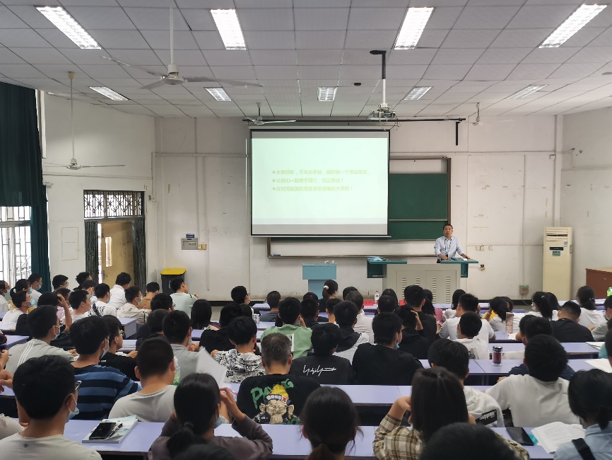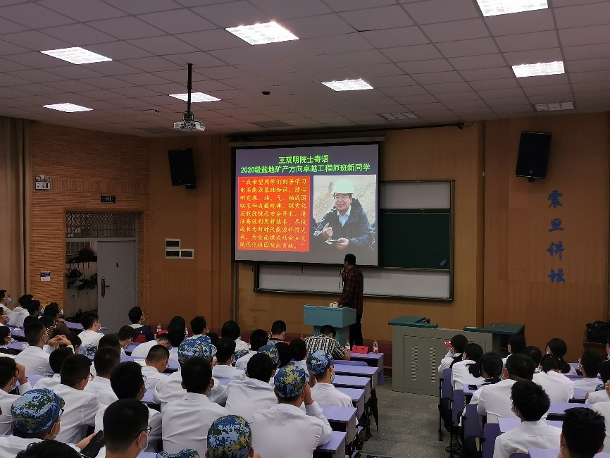 副校长王华教授、全国模范教师、盆地矿产系主任焦养泉教授、学院副院长严德天教授等在教三110教室,为2020级本科生作盆地矿产方向专业报告,并希望全体新生厚实专业基础、学好专业本领。