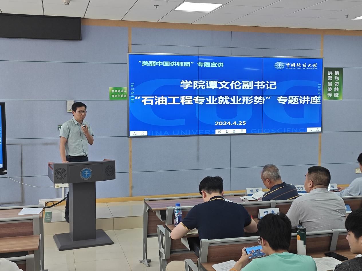 接着,谭文伦作“石油工程专业就业形势”主题宣讲。他介绍了石油工程专业在招生、转专业、就业等三个方面的情况,深入梳理和分析了近十年来石油工程专业的就业形势,并围绕学生招生、培养和就业等方面提出了有组织开展招生宣传、推进学生双创赛事、加大校企合作力度等相关意见。