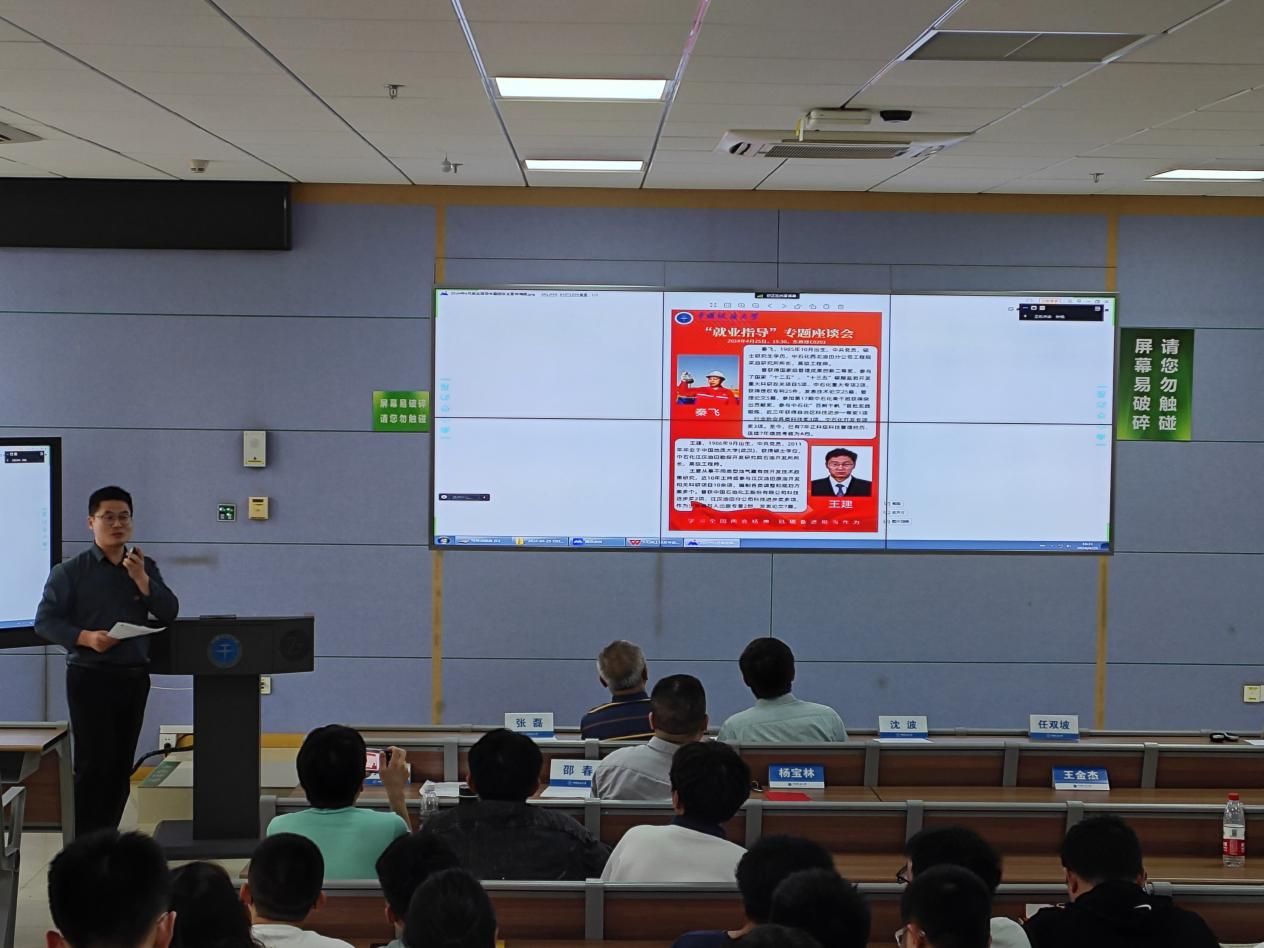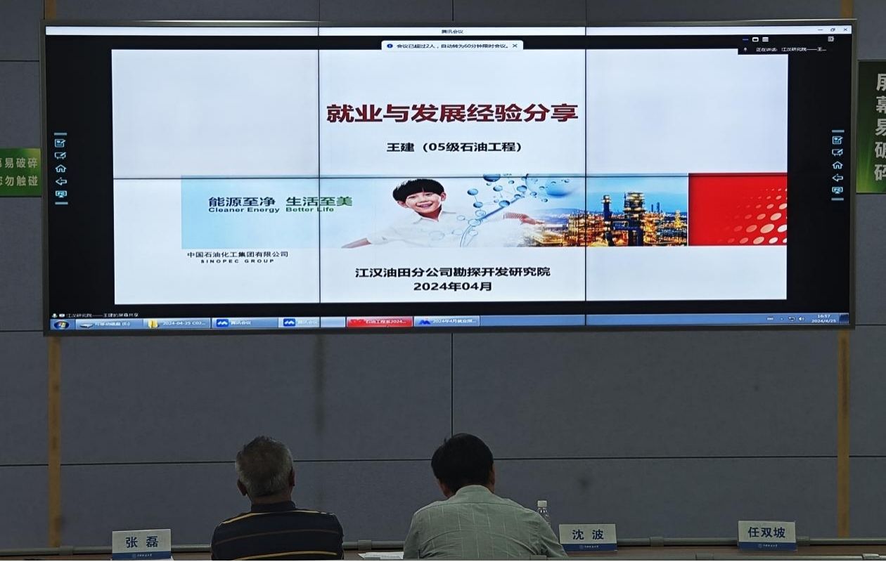 最后,学院优秀校友中石化西北油田分公司秦飞、中石化江汉油田分公司王建,分别结合自身工作与成长经历,作就业与发展经验分享。秦飞从求职面试和职场从业心得、油田成长环境与发展空间、企业急需人才类型与特点等方面分享了个人在就业方面的心得体会。