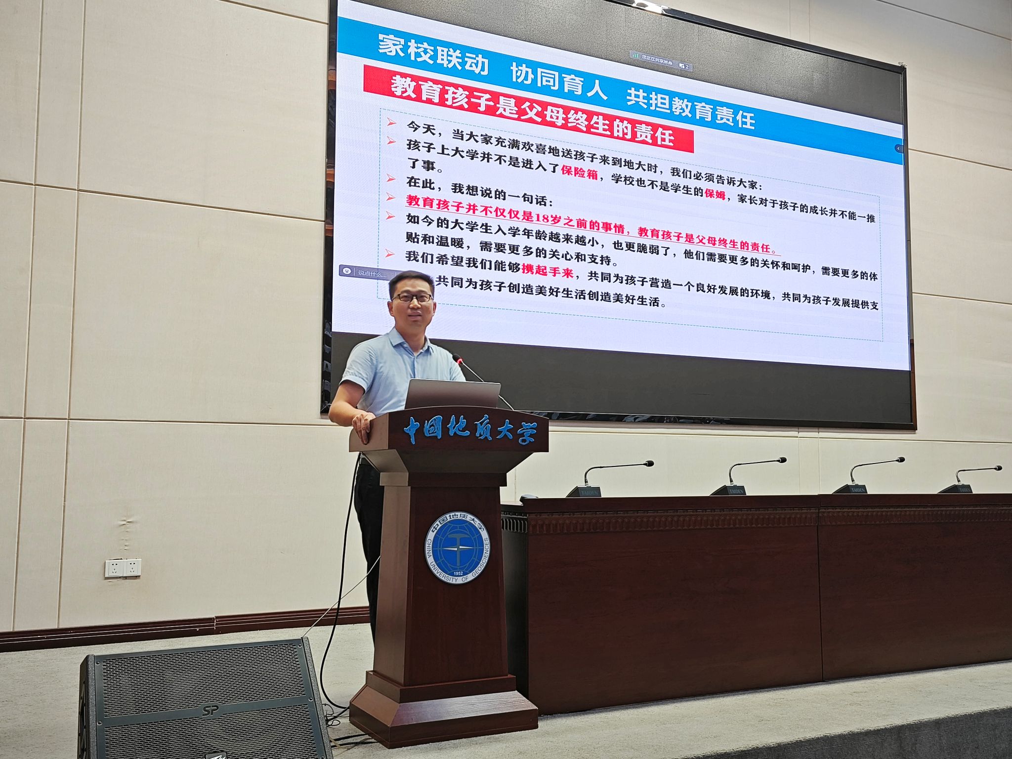 谭文伦以“家校协同育人,共担教育责任”为主题,从人生引导、生活支持和感情交流等方面介绍了大学学生日常管理、新生适应与调整、学生安全防范和入学教育安排等方面的情况。