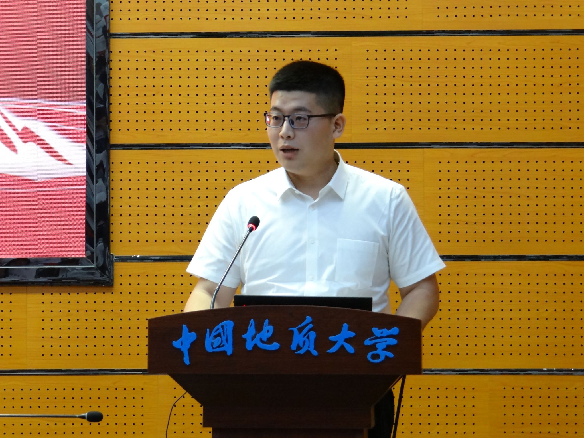 教师代表、湖北名师徐思煌教授发言。他回忆了自己受李四光精神感召下选择地质学专业,并在教育工作中践行科学家精神的经历。他强调野外实践与科研创新相结合对培养拔尖创新人才的关键作用。他鼓励同学们在夯实学业基础上,积极参加创新创业赛事,不断磨练创新思维,成长成才。