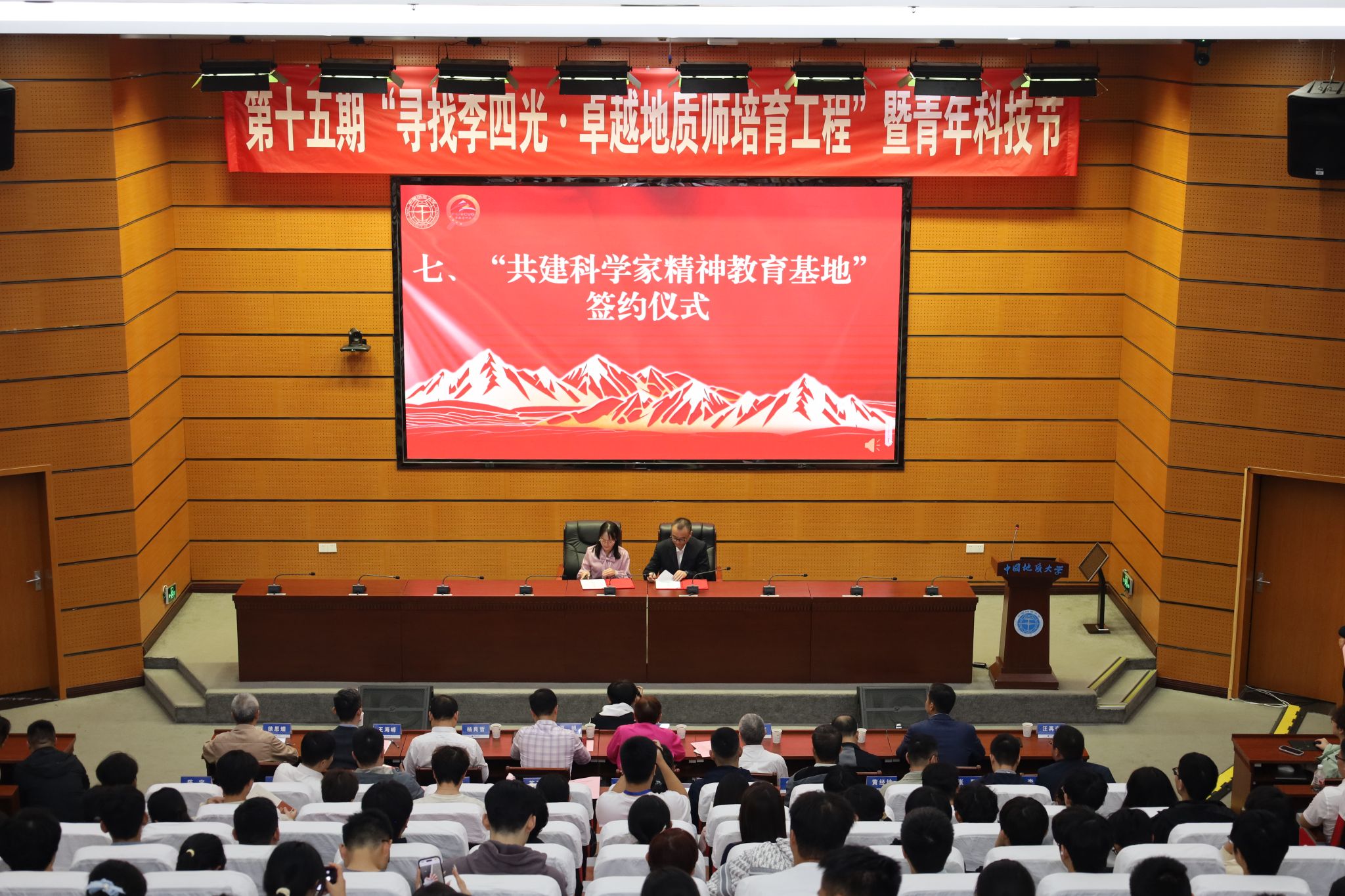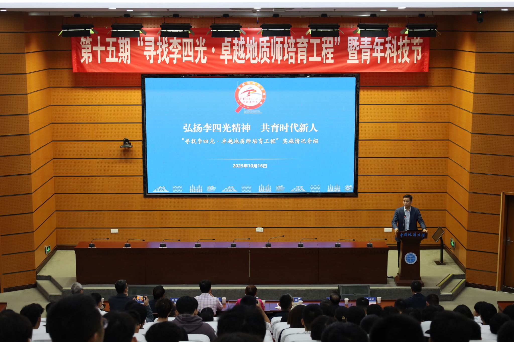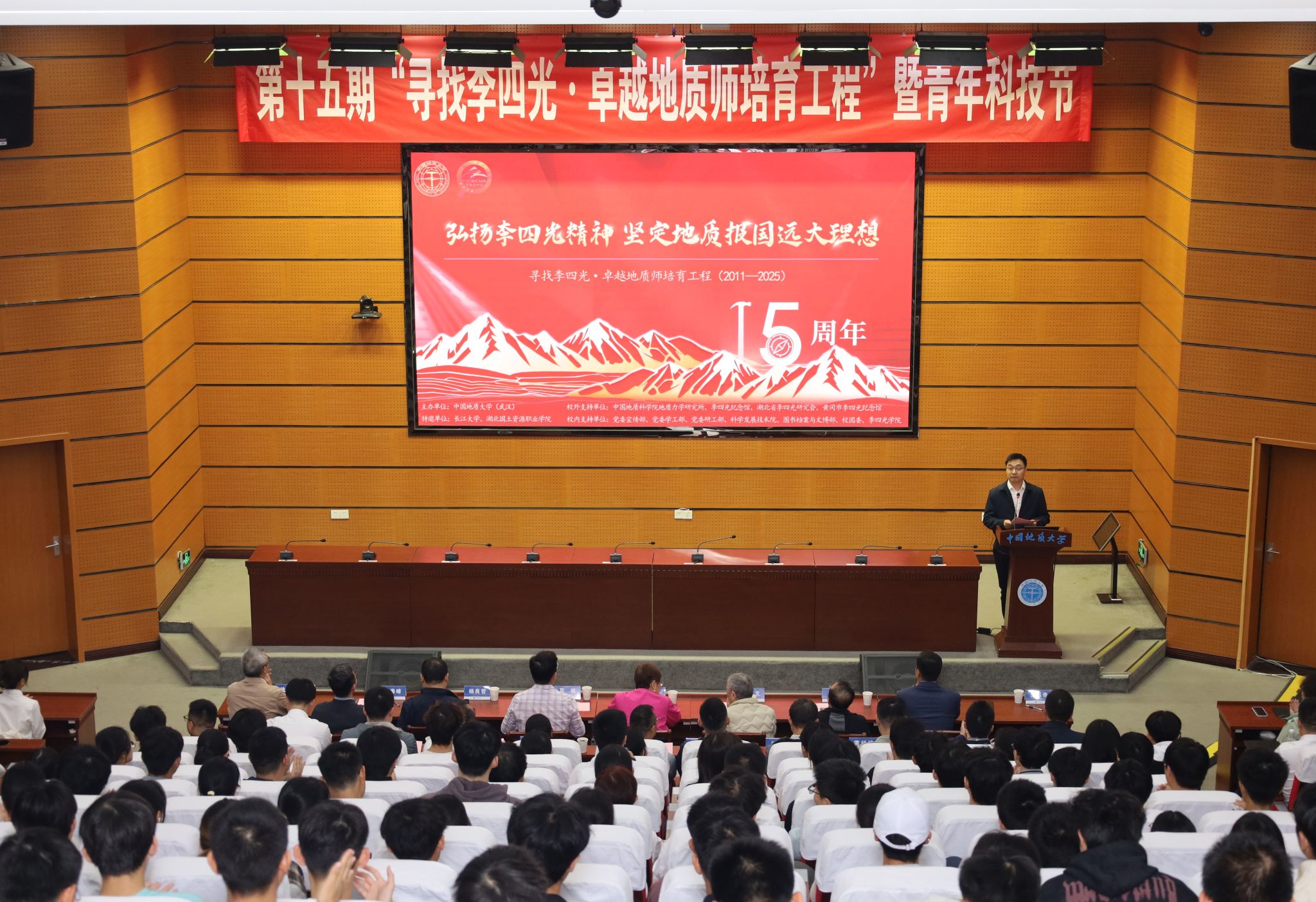 副校长夏帆致辞。他回顾了李四光先生为新中国地质事业作出的重要贡献。他谈到,弘扬和传承李四光精神,是学校文化育人、实践育人的重要使命。学校连续15年举办“寻找李四光·卓越地质师培育工程”,成为集党建思政、学科建设、实践育人、文化传播等为一体的综合实践育人品牌。他寄语青年学子:心怀“国之大者”,做服务国家战略的“先行者”;“向深而进”,做驱动“新质生产力”的“创新者”;勇担“时代使命”,做挺膺担当的“实干家”。
