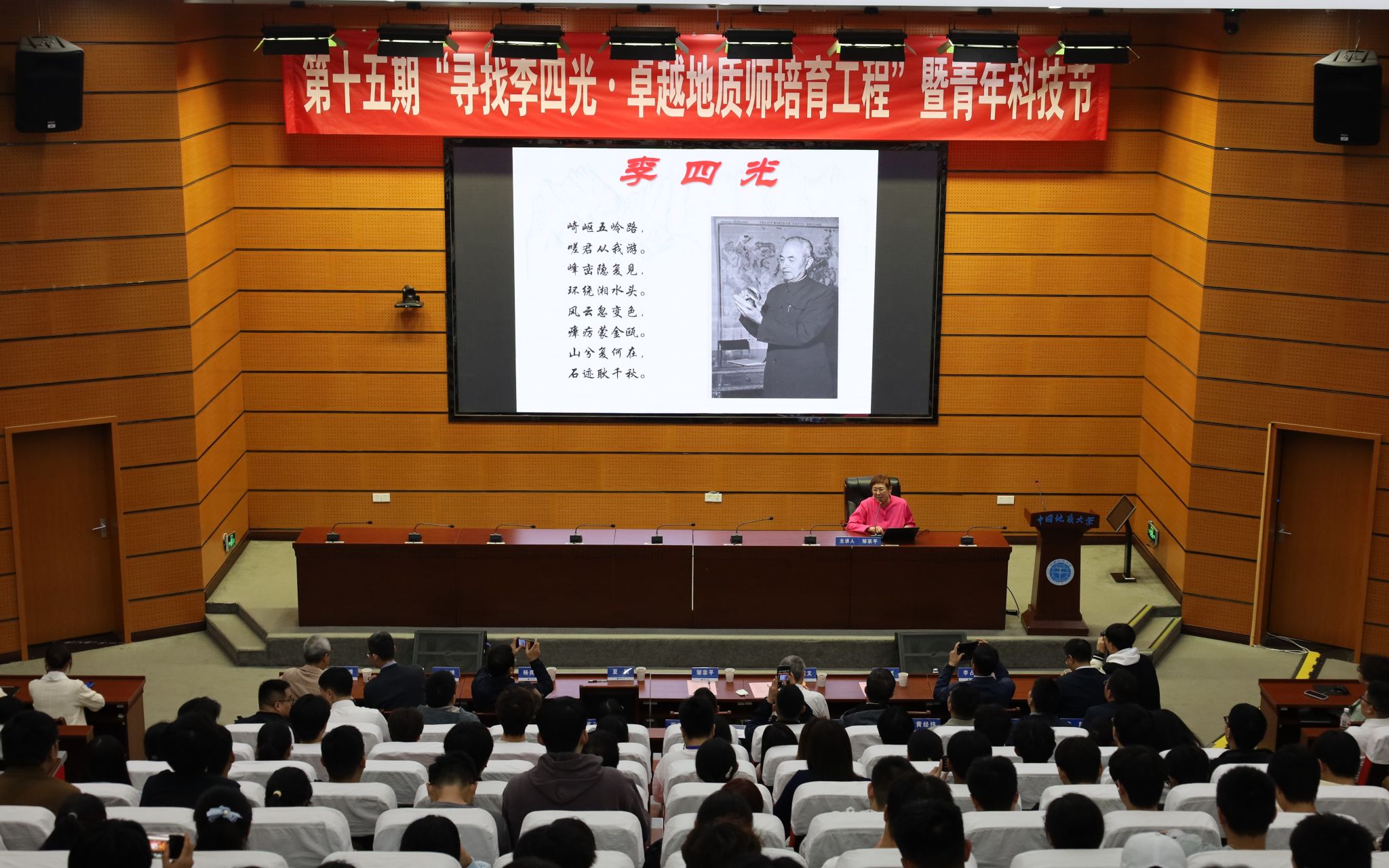 在南望山校区东教楼A0113教室举行第十五期“寻找李四光·卓越地质师培育工程”开幕式暨“李四光精神”报告会。中国科学家精神宣讲团成员、李四光纪念馆高级顾问、李四光先生外孙女邹宗平女士,李四光纪念馆黄启文先生,湖北省李四光研究会副秘书长、湖北省地质科学研究院副院长杨良哲,黄冈市李四光纪念馆办公室主任夏炜,日本av在线看