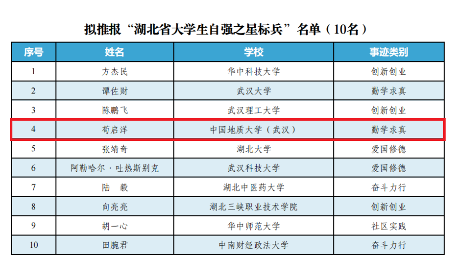 今年4月,团湖北省委学校部、湖北省学联秘书处启动了2022年度“大学生自强之星”推报工作。经校院推荐、省级遴选、宣传展示、专家评审等环节,日本av在线看 2020级矿产普查与勘探专业苟启洋同学荣获2022年度“湖北省大学生自强之星标兵”(湖北省仅10名),同时被等额推报 “中国大学生自强之星”评选。