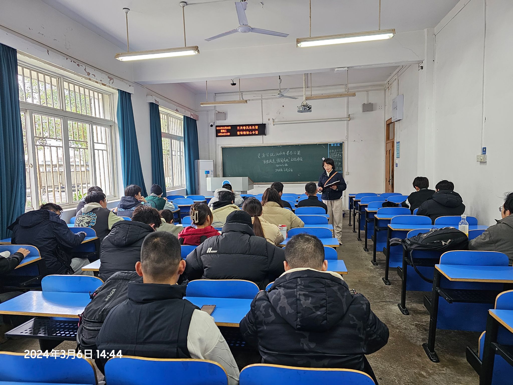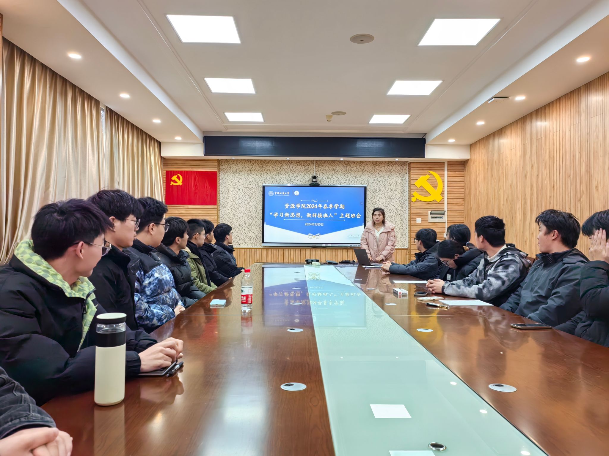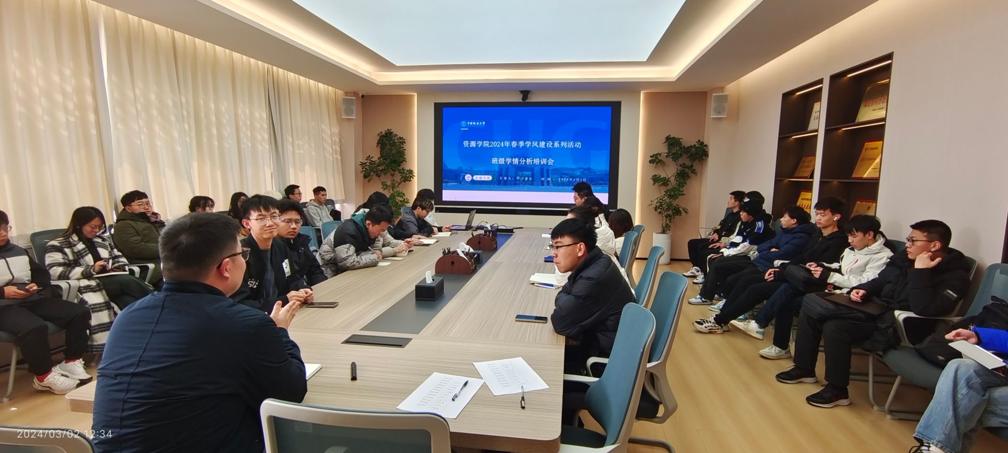 2024 年春季学期系列教育引导活动班级工作布置会在主楼330 举行,学院各班班长参加会议,辅导员彭鑫就春季学期班级学生返校思想动态调研、安全教育、心理健康等重点工作进行布置,并以“学习新思想,做好接班人 ”“技能成才,强国有我 ”为主题布置新学期首次主题班会。