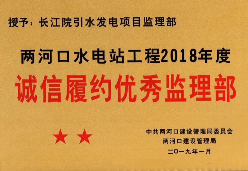 诚信履约带来了多方认可,2019年监理部荣获国家重点工程两河口水电站质量管理先进单位、档案管理先进单位,2020年荣获国家重点工程两河口水电站下闸蓄水阶段(2018-2020)克难攻坚特别贡献奖、质量管理先进单位、安全生产先进单位、档案管理先进单位等诸多荣誉。